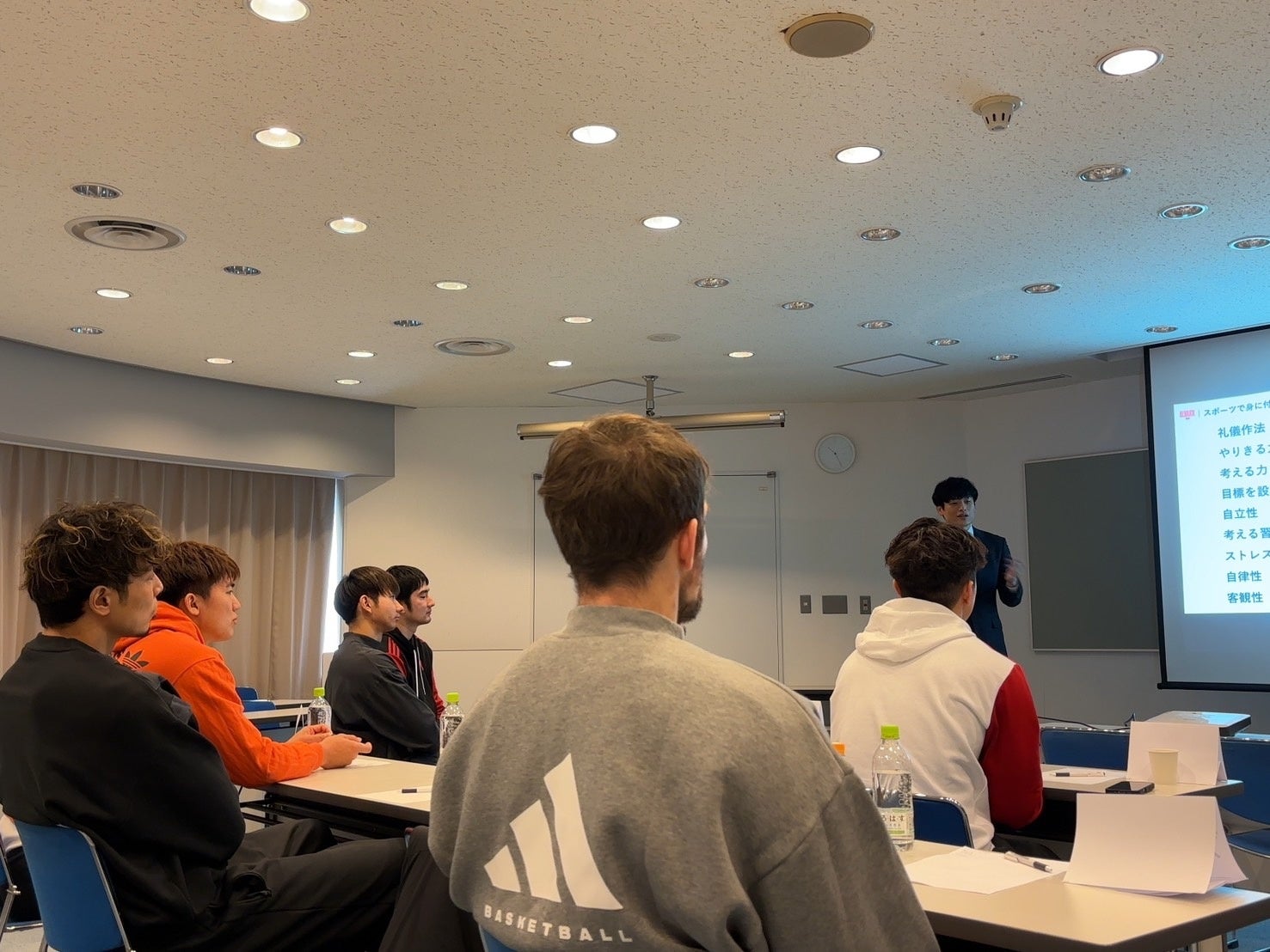 研修1日目では、元ハンドボール日本代表主将であり、現在は北國ハニービー石川の監督を務める当社の東が、「アスリートに求められる社会常識」をテーマに講義を行いました。私たちは、スポーツリーグやクラブも基本的には一般企業と同じで、プロアスリートも一社会人であると考えています。