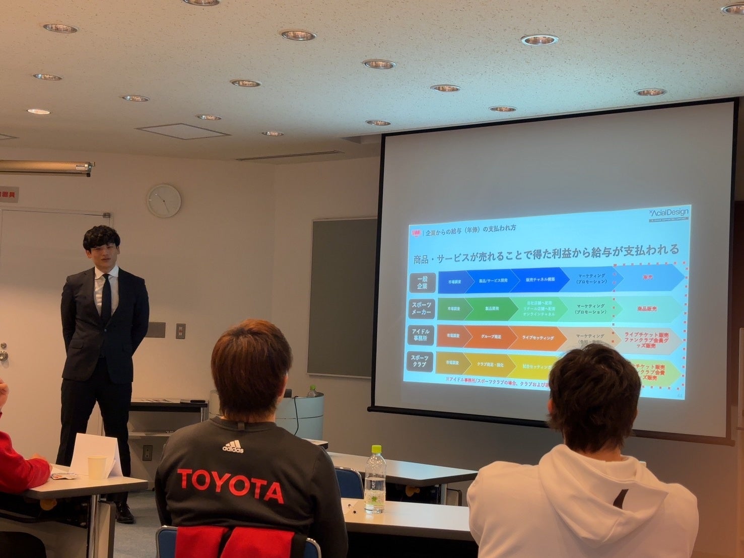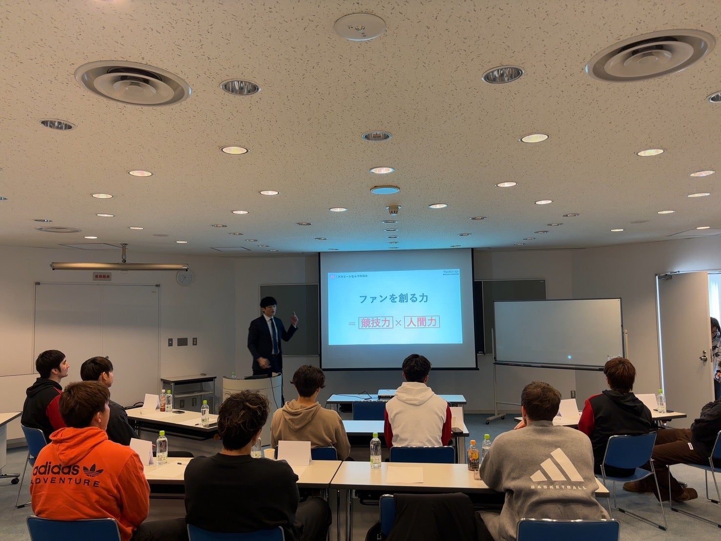 研修2日目は「アスリートの価値について」講義を行い、「ファンを創る力=競技力×人間力」であり、現役時代のうちにファンを創ることが引退後の活動に大きな影響を及ぼすことを学んでいただきました。
