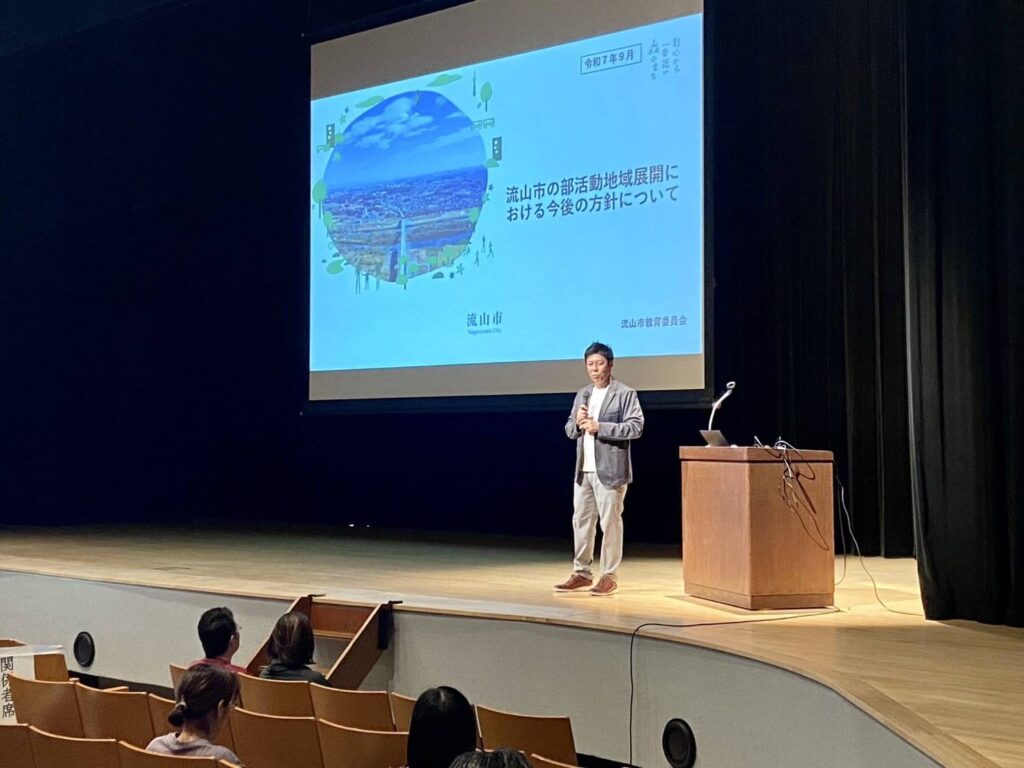 部活動の地域展開に関する背景と今後の方向性について、流山市教育委員会より説明が行われました。「子どもたちが安心して活動できる環境を守るためには、学校だけでなく地域全体で支える仕組みが必要です。外部指導員の配置や地域クラブの立ち上げを通じて、持続可能な部活動のあり方を模索していきます。」と語り、地域展開にあたっては段階的な対応と地域との連携が不可欠であるとの認識が示されました。
